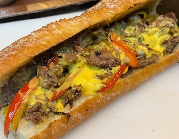 ince dana antrikot dilimleri, mozarella , cheddar peyniri, kalifornia biberi ve soğan